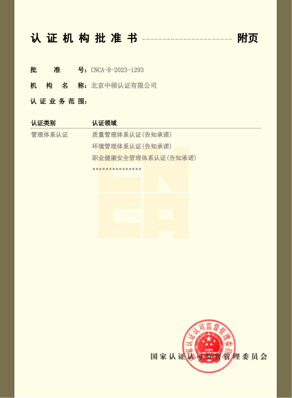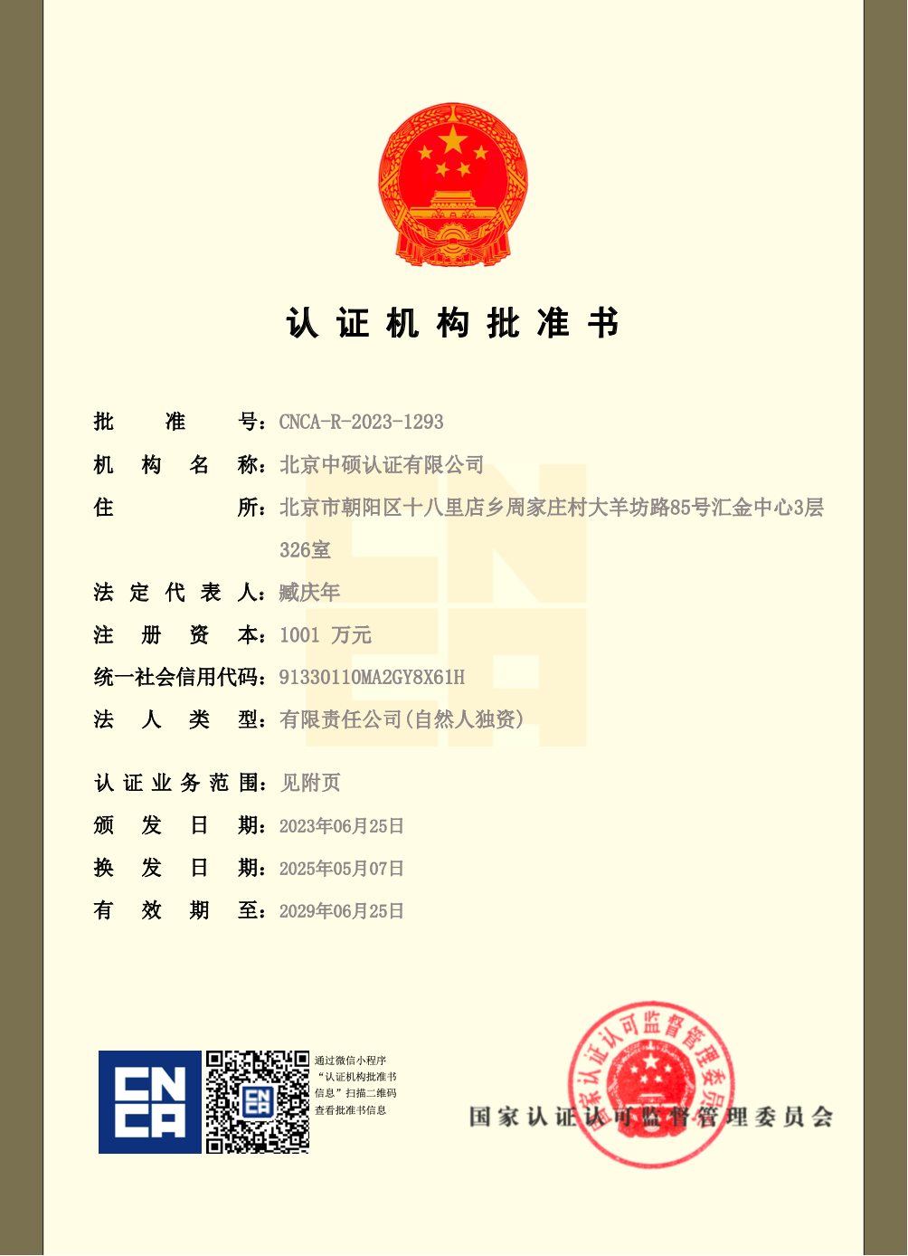 北京中硕认证有限公司是经工商注册,国家认证认可监督管理委员会批准的认证服务机构,(批准号:CNCA-R-2023-1293,具体批准号请查询CNCA官网)。